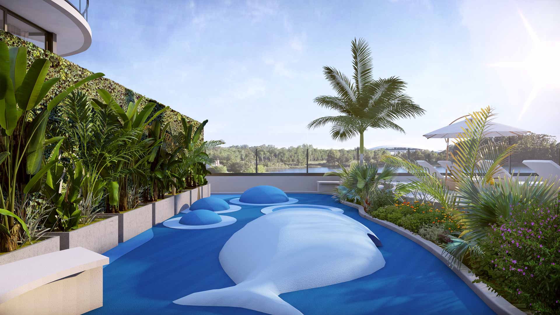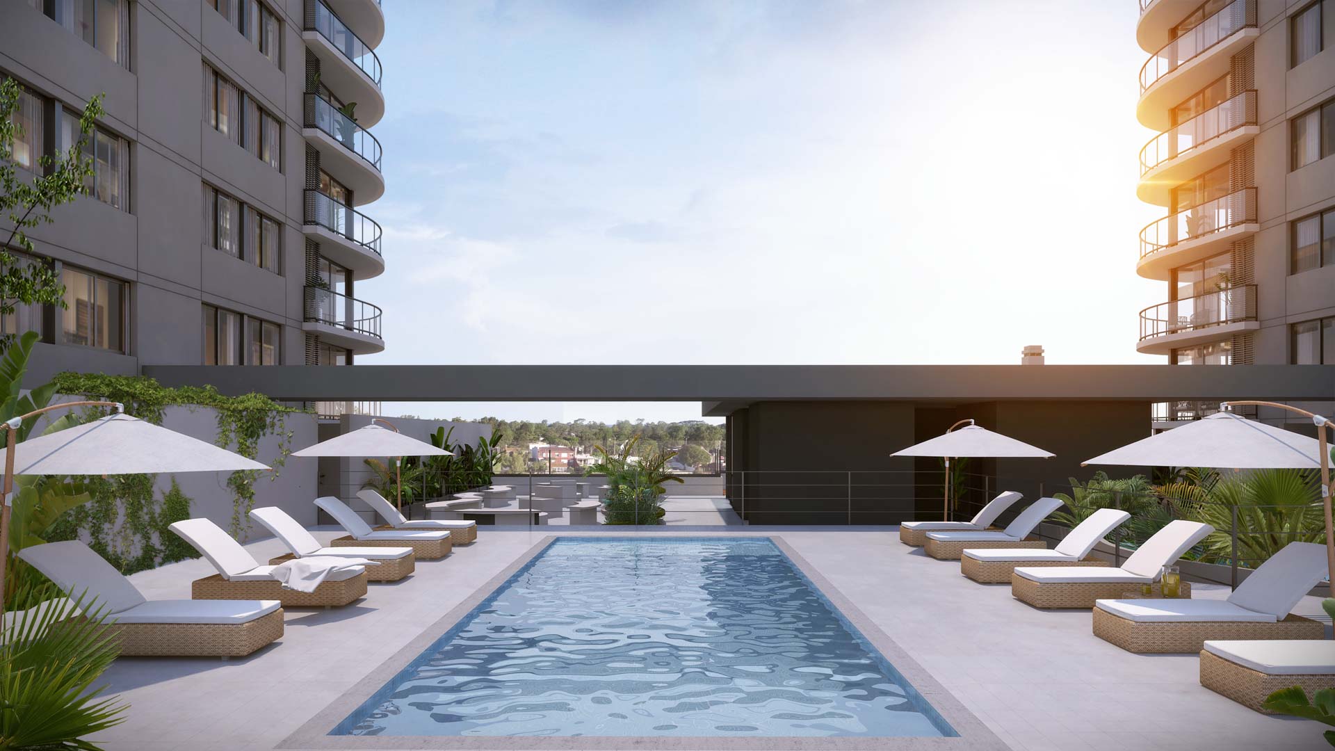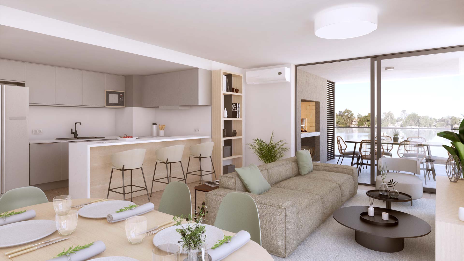 Entre las torres, se despliegan exclusivos amenities que conectan todas las torres. Esta área de enlace se ha diseñado con un esmerado cuidado proporcionando un recorrido único y atractivo sobre el lago Pesquero, que invitará a disfrutar de cada detalle del entorno.